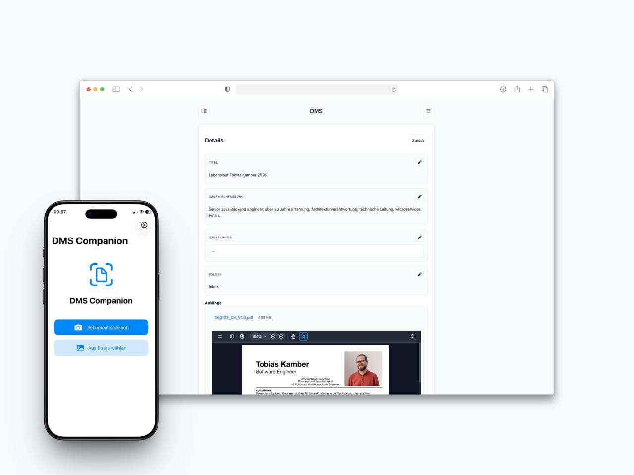 Eine iOS-Companion-App ermöglicht das Scannen und Importieren von Dokumenten direkt vom Smartphone. Die Share-Extension erlaubt das Teilen von Dokumenten aus anderen Apps heraus.