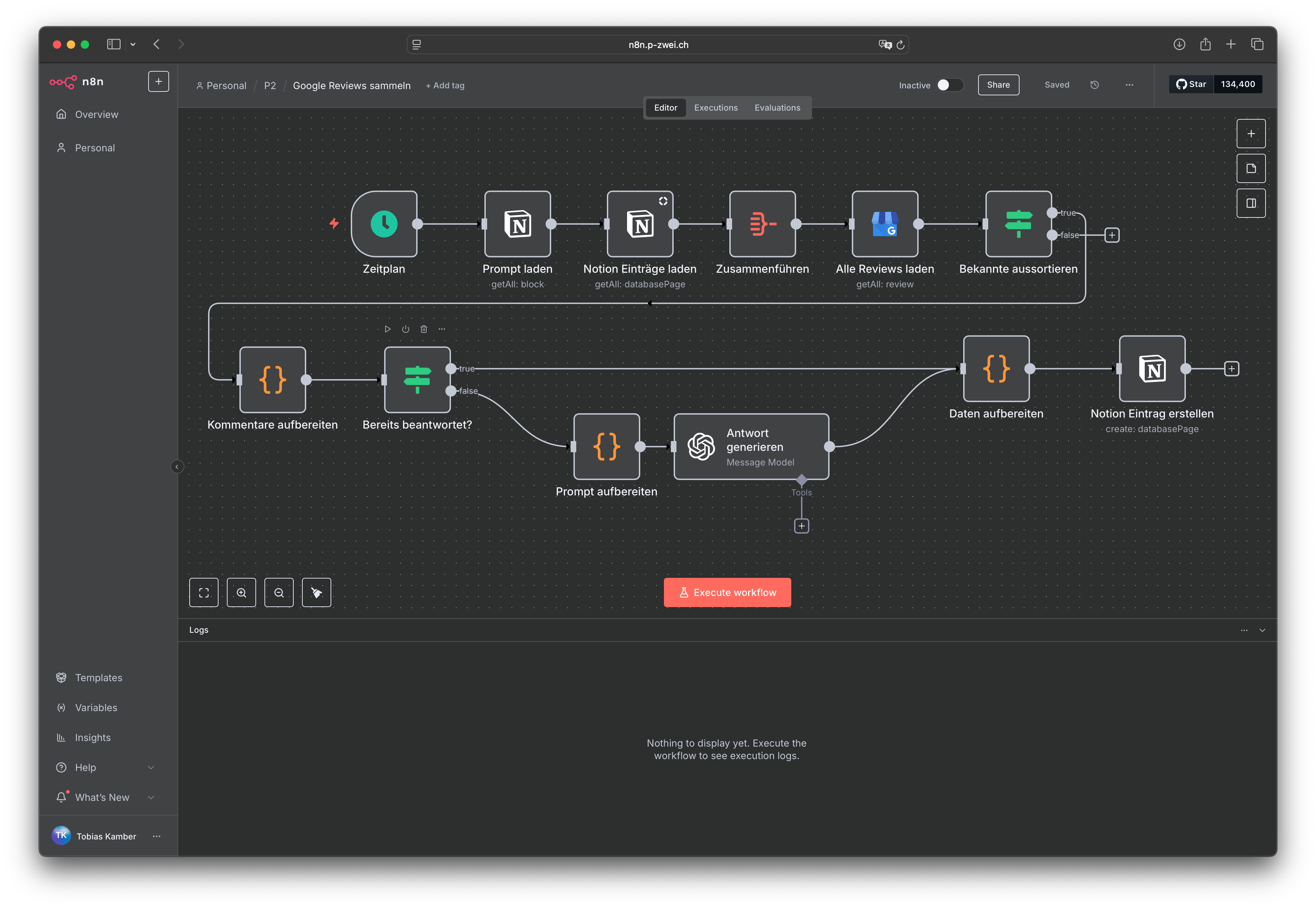 n8n, Google Business Profile API, Notion API, OpenAI, individueller JavaScript Code
